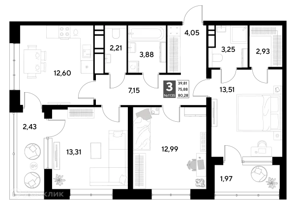 3 комн. квартира в ЖК Квартал ДРАВЕРТА